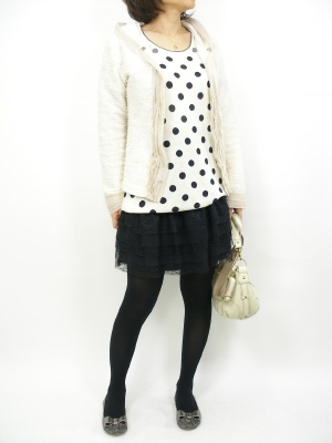 ドット柄がカワイイニットは、優しいカジュアルに仕上げたい。ツイードを合わせれば子供っぽくなりません!フェミニン度100%。