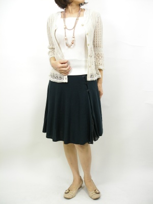 クロシェカーデェは質感の柔らかさが上品さを表現してくれます。定番甘口ファッションで、ママ友のランチに!フェミニン度100%。