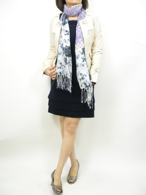 ストールの色を効かせてワンピースの紺をアピール。しっかりしたミラノリブのワンピースは体のラインが気になりませんね!エレガンス度80%、フェミニン度20%。