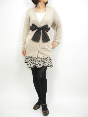 大きなリボンのロングカーデをミニスカートと合わせたキュートなコーディネート!フェミニン度90%、スタイリッシュ度10%。