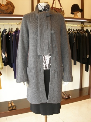 白黒グレーのモノトーンでインナーは白黒のハキッリしたコーディネート。ニットコートは今年人気商品ですね!スタイリッシュ度80%、エレガンス度20%。