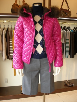 強いピンクのダウンはインパクト大!あえて優等生っぽいニットとパンツを合わせて上品カジュアルに!アクティブ度80%、スタイリッシュ度20%。
