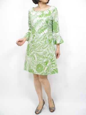 トロピカルプリントのきれい色ワンピは一枚でサマになりますね。胸元や袖のビジューがアクセサリーかわりです!エレガンス度80%、フェミニン度20%。