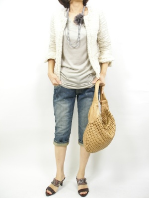ツイードJKをデニムでカジュアルに着こなす。インナーは上質ニットで大人っぽさをアピール。メッシュバックが夏にかけて活躍しそうですね!スタイリッシュ度80%、アクティブ度20%。