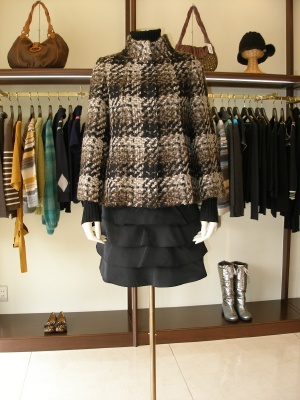 ジャケットとスカート。全く違った素材を合わせるのがお洒落!スタイリッシュ度70%、エレガンス度30%。