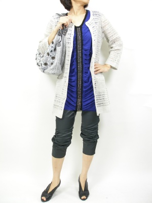 クロシェのロングカーディはさっと羽織るのにとても重宝。カジュアルなパンツでカッコ良く着こなしたい!スタイリッシュ度80%、アクティブ度20%。