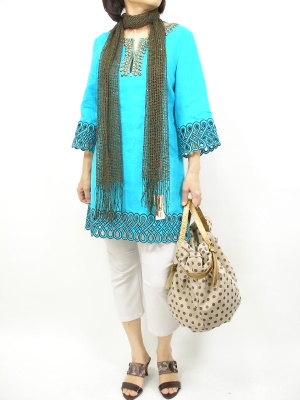 ターコイズブルーな綺麗なチュニックワンピ。ダークなストールを合わせて大人カジュアルの完成!アクティブ度70%、スタイリッシュ度30%。
