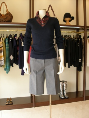 トラッドの組み合わせ紺×グレー。さらに襟の所がチェックでお洒落。大きめのBAGが斜めがけにもなって使いやすい!アクティブ度100%。