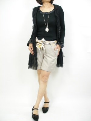 パンツのベルトをスカーフでアレンジ。レースジレは黒で統一してモダンな中にフェミニンな要素を取り入れました!フェミニン度70%、スタイリッシュ度30%。