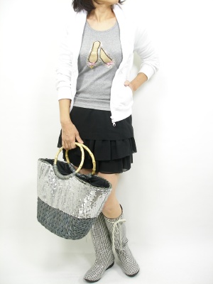 カジュアルなパーカにはあえてティアードスカートを合わせてキュートに。そして可愛いレインブーツがあればミニ丈にもトライしやすい!アクティブ度60%、フェミニン度40%。