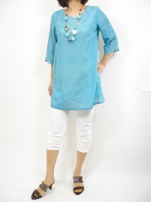鮮やかなブルーが目を引きますね。白のパンツとのコントラストが綺麗なチュニックコーディネートです!スタイリッシュ度70%、フェミニン度30%。