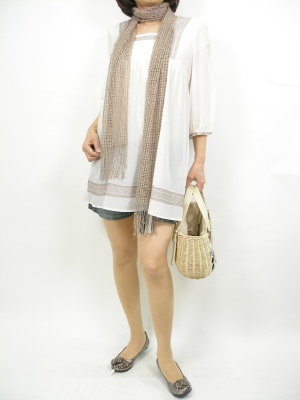 フォークロアなチュニックにはやっぱりデニムが良く合います。ちらりと見えるくらいのショートパンツだとキュートです!フェミニン度60%、アクティブ度40%。