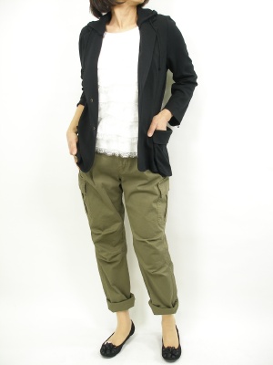フード付きジャケットをカーゴの男の子みたいなコーディには、フリフリインナーが絶対可愛い。足元はロールアップがお約束です!アクティブ度70%、フェミニン度30%。