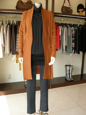 ロングニットカーデェガンは、スレンダーに細みのシルエットで全身をまとめて・・。ボーツもいいですがパンプスをお勧めします!スタイリッシュ度100%