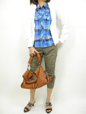 チェックシャツはカジュアルには欠かせません。ブルー×カーキ×白の爽やかな色の組合せで颯爽と・・・。アクティブ度100%。