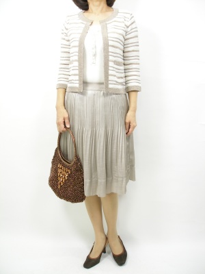 上品をそのままコーディネートにしたようなベージュ系とラメ系とのバランスが取れていますね。ソイヤーバッグの色が全体を引き締めます!エレガンス度100%。