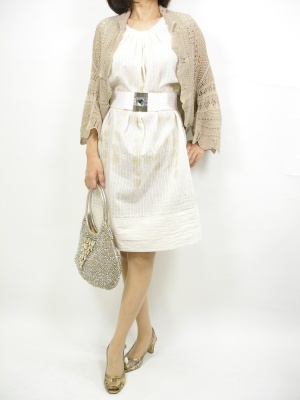 金色ラメの刺繍とボレロ。そしてバッグ、靴までゴールドを利したコーディネートで思いっきり上品に!エレガンス度100%。