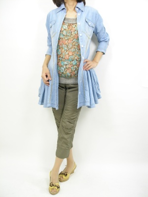 ダンガリーシャツは小花柄と合わせてスイートなカントリー風に。エッジの効いたデザインなら素朴すぎず程よくお洒落!アクティブ度80%、フェミニン度20%。