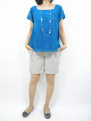 スクエアカットの裾開き。透かし網ののカワイイニットは色もオシャレ。アクセントは花柄のアクセサリーです!フェミニン度90%、アクティブ度10%。