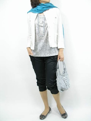 サルエルカーゴパンツとツイードのジャケット。甘辛ファッション。シルバーグレー×黒の中にブルーのストールが効いています。エレガンス度70%、スタイリッシュ度30%。