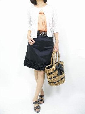 夏のお出かけにぴったりな白のカーディガン。インナーのオレンジ色が綺麗に映えます!フェミニン度80%、エレガンス度20%。