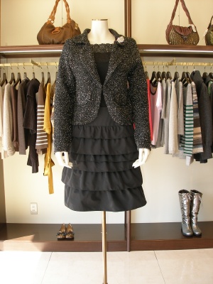 ちょっとしたパーティや食事会などに便利なニットジャケット。華やかでいて、少しだけカジュアルな雰囲気です!エレガンス度90%、フェミニン度10%。