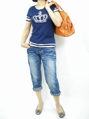 キラキラのクラウンがカワイイニット。デニムとのシンプルコーディも手抜きに見えない可愛さです!アクティブ度100%。