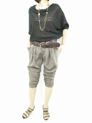 ドルマンニットとサルエルパンツのコーディは辛口派の新定番になりそう。ブラウンの小物でサファリっぽい味つけを!スタイリッシュ度90%、アクティブ度10%。