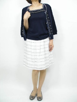 白×紺の上品な組合せは、夏らしい清涼感をとても感じます。カーディはちょっと方に羽織って・・。フェミニン度100%。