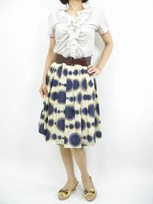 大きな柄のスカートは、インパクト大なのでトップスは少しベーシックにしてウエストだけ濃い色をポイントにしました。フェミニン度100%。
