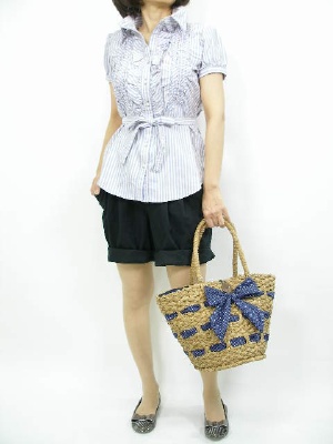 | キャサリンハーネルのシャツは、これだけで文句なしのコーディネートになります。リボンを前でギュッと絞って・・。バッグのリボンとリンクさせてみました!アクティブ度80%、フェミニン度20%。 |