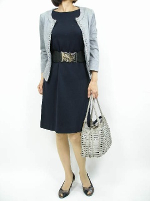 ネイビーのワンピースなら、きちんとしながらもソフトな印象に。ベルトでウエストマークすればさらにバランス良くなります!エレガンス度80%、スタイリッシュ度20%。