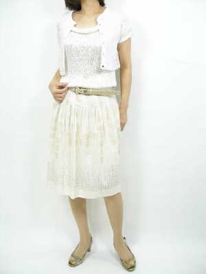 白×ゴールドのツートンカラーをベースに、ボレロタイプの短丈ニットはふんわりしたスカートと相性ピッタリです!エレガンス度80%、フェミニン度20%。