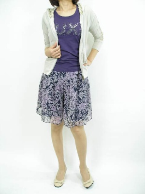 フェミニンなキュロットをカジュアルにアレンジしてみました。スパンコール使いのパーカならスポーティ過ぎません!フェミニン度60%、アクティブ度40%。