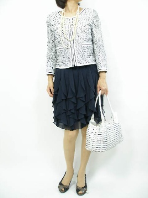 きちんと感を出したい時は、やっぱりジャケットが一番。シフォンのスカートを合わせて軽やかに!エレガンス度90%、スタイリッシュ度10%。