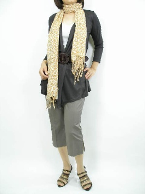 カシュクールにもなるドレープカーデ。ベルトを使った着こなしも素敵です。さらにストールを付ければ辛口カジュアルの完成です!スタイリッシュ度90%、アクティブ度10%。