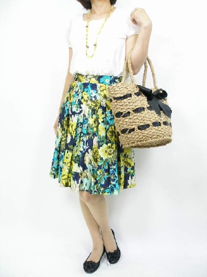 フェミニン派のお出かけ着には、フリルと花柄が欠かせない。大き目の花柄なら甘すぎません!フェミニン度90%、エレガンス度10%。