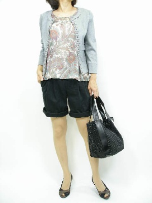 ふんわりしたブラウスはカチッとジャケットを羽織るとスッキリ見えます。あえてカジュアルなショートパンツで遊びを出しました!スタイリッシュ度60%、アクティブ度40%。