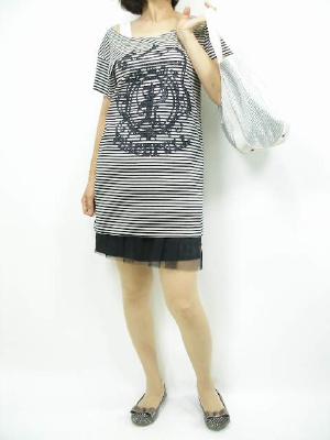 カジュアルなボーダーからティアードスカートをチラリとのぞかせて。色は控えめにすれば大人のガーリーに!アクティブ度80%、フェミニン度20%。