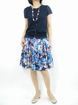 上品な花柄プリントなら大人の女性も受け入れやすい。濃紺のニットが清涼感を出してくれます!フェミニン度80%、エレガンス度20%。