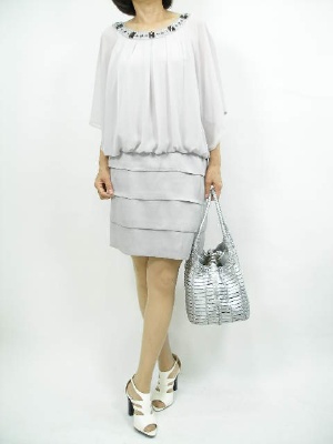 シフォンやキラキラのビジューが女心をくすぐるワンピース。凝ったデザインでコーディネート要らず、しかもベルスリーブでニの腕もカバー!エレガンス度90%、スタイリッシュ度10%。