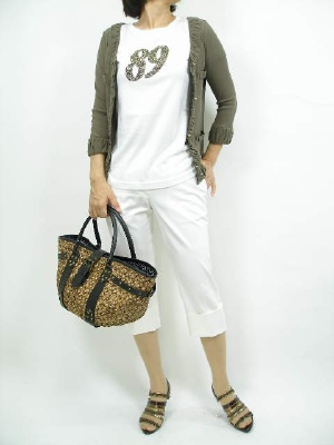 カーディガンのインナーはキャミソールも女らしいけど、ロゴTでちょっと外すのもオシャレですね!スタイリッシュ度80%、アクティブ度20%。