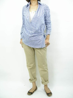 ストライプのカシュクールシャツはカジュアルチノを無造作にロールアップして合わせたい。御近所ファッションもさりげないお洒落で!アクティブ度80%、スタイリッシュ度20%。