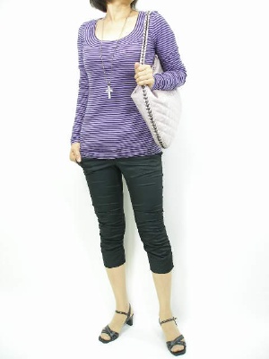 紫の濃淡ボーダーは相性のいい黒とシルバーで合わせて。パンツに光沢があるのでカジュアルにはなりすぎません!アクティブ度90%、スタイリッシュ度10%。
