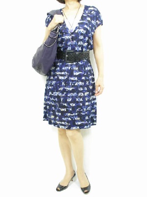 涼しい生地のワンピースは夏には欠かせません。ちょっとベルトでウエストマークするとカジュアルラインもお出かけモードに変身。ベルトは私物。エレガンス度80%、フェミニン度20%。