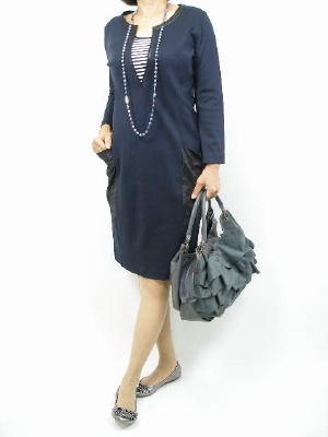 秋の初めにネイビーのワンピースがあると便利です。シンプルコーディネートでもお洒落に見えますよ!フェミニン度60%、エレガンス度40%。