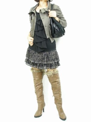 ゴツめデザインブルゾンはヒラヒラミニと相性バッチリ。そしてミニスカートにはニーハイブーツですよね!スタイリッシュ度80%、アクティブ度20%。