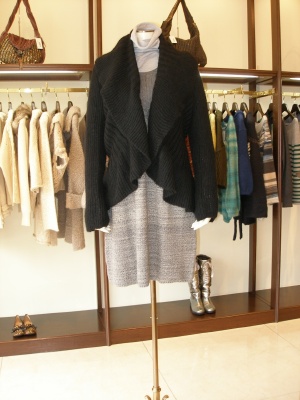 ニットカーデェはドレープの襟がとてもエレガントです。冬のお出かけにぴったり!タイツとブーティーで。エレガンス度70%、フェミニン度30%。