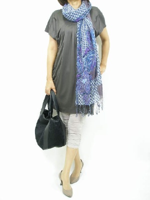 ワンピースは裾絞りのスッキリタイプ。アクセントのストールをざっくりと巻き付けてカッコ良く着こなしたい!スタイリッシュ度90%、エレガンス度10%。