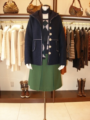 圧縮ニットのパーカは、スカートでもパンツでもOK。脱いだ時アーガイルの可愛いニットが印象的に!フェミニン度100%。